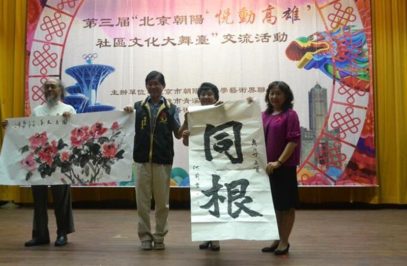 此次交流活動以社區、民間社團為基點,以文藝演出、藝術交流、藝術展覽等多種形式打造新的文化亮點,活動現場還舉辦了書畫筆會和手工藝互動活動。中國書法家協會會員沈莉書寫的“同根”,向臺灣民眾傳達了“兩岸一家親”的美好愿望;國家一級美術師、朝陽區美術家協會理事靳耀華現場創作了國畫《國色天香》,作為禮物送給了李玉文會長。編織能手李貞、張莉華老師現場展示了用五彩線編織的工藝品,有栩栩如生的蝴蝶、有精美大方的手鏈,吸引了不少臺灣民眾的眼光。有些人還躍躍欲試,紛紛拿起彩線,跟老師們學著編織。高雄市正文團隊里長莊文忠表示,臺灣民眾對文化非常感興趣,有些人以前從來沒有接觸過這些傳統手工技藝,這次交流活動提供了一個很好的機會。