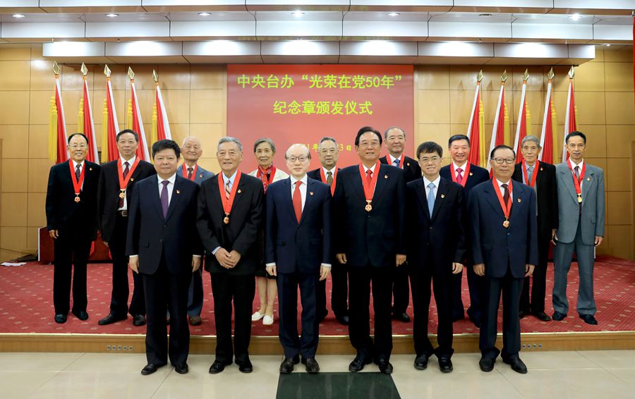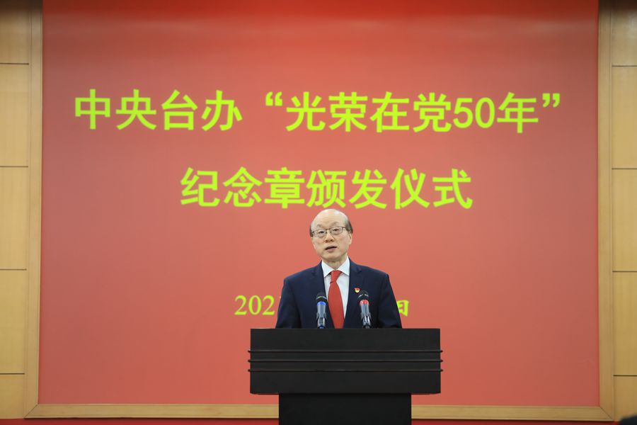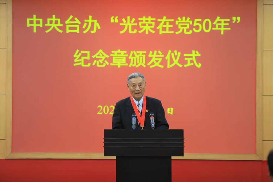 他指出,黨的事業,人民的事業,是一代又一代的共產黨人鑄成的。今天我們舉行紀念章頒發儀式,就是要銘記老同志們的歷史功績,以優秀的老同志為榜樣,激發廣大黨員干部的榮譽感、歸屬感、使命感,肩負開啟新征程、奮斗新時代的光榮使命。每一位黨員,不論黨齡長短,不論職務高低,都要永遠牢記入黨時的莊嚴誓言,像“光榮在黨50年”的老黨員一樣,用奮斗為黨旗增光添彩,在踏上全面建設社會主義現代化國家的新征程中,繼往開來、銳意進取,奮力推進兩岸關系和平發展和祖國統一。