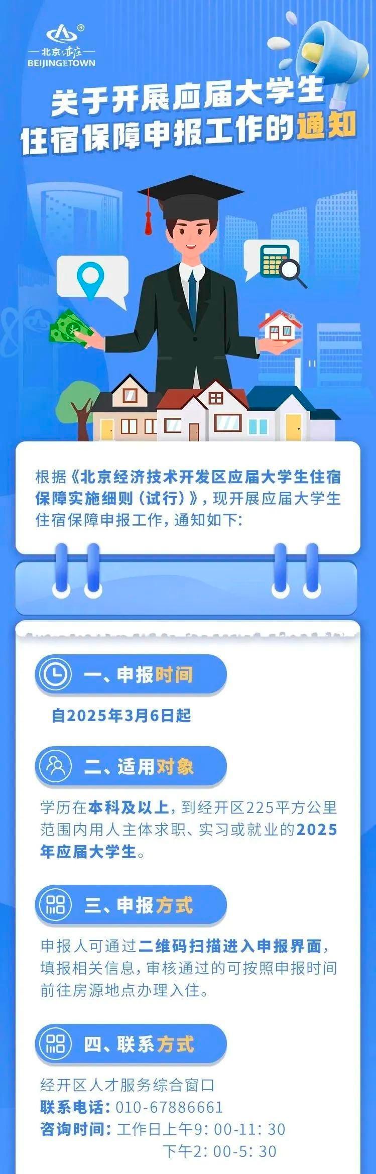 北京經(jīng)開區(qū)此前推出的“求職7日免費(fèi)住宿——實(shí)習(xí)3個(gè)月免費(fèi)短租——就業(yè)3年優(yōu)惠長租”的階梯式安居政策,有了申報(bào)渠道。3月6日起,符合條件的2025年應(yīng)屆大學(xué)生,可以掃碼進(jìn)行申報(bào)。