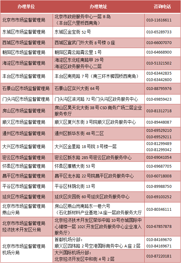 各區登記注冊部門地址及咨詢電話見下表: